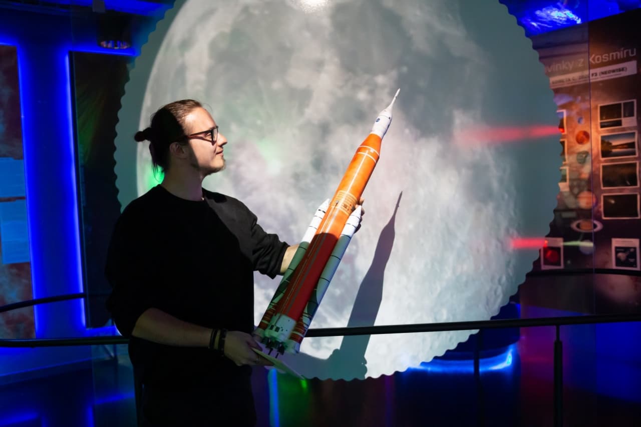 Společně prozkoumáme jednotlivé měsíční fáze a ukážeme si, jak vznikají krátery na povrchu našeho nejbližšího vesmírného souseda. Zavzpomínáme na léto roku 1969, kdy lidé poprvé stanuli na Měsíci, a připomeneme si nedávné úspěchy prvního letu programu Artemis, který má za cíl zopakovat vyslání lidské posádky na Měsíc. Vytvoříme slavný odlitek Armstrongovy měsíční stopy, seznámíme se se členy legendárního kosmického letu Apollo 11 i budoucího letu Artemis II. Prozkoumáme, z jakých částí se skládal Saturn V a jak vypadá současná moderní raketa SLS. Zahrajeme si na vesmírné konstruktéry a experimentálně zjistíme, který materiál se hodí pro výrobu kosmické lodi.