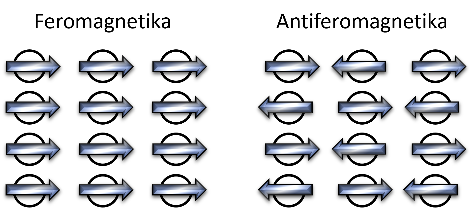 Obrázek 2: Orientace spinů ve feromagnetických a antiferomagnetických látkách