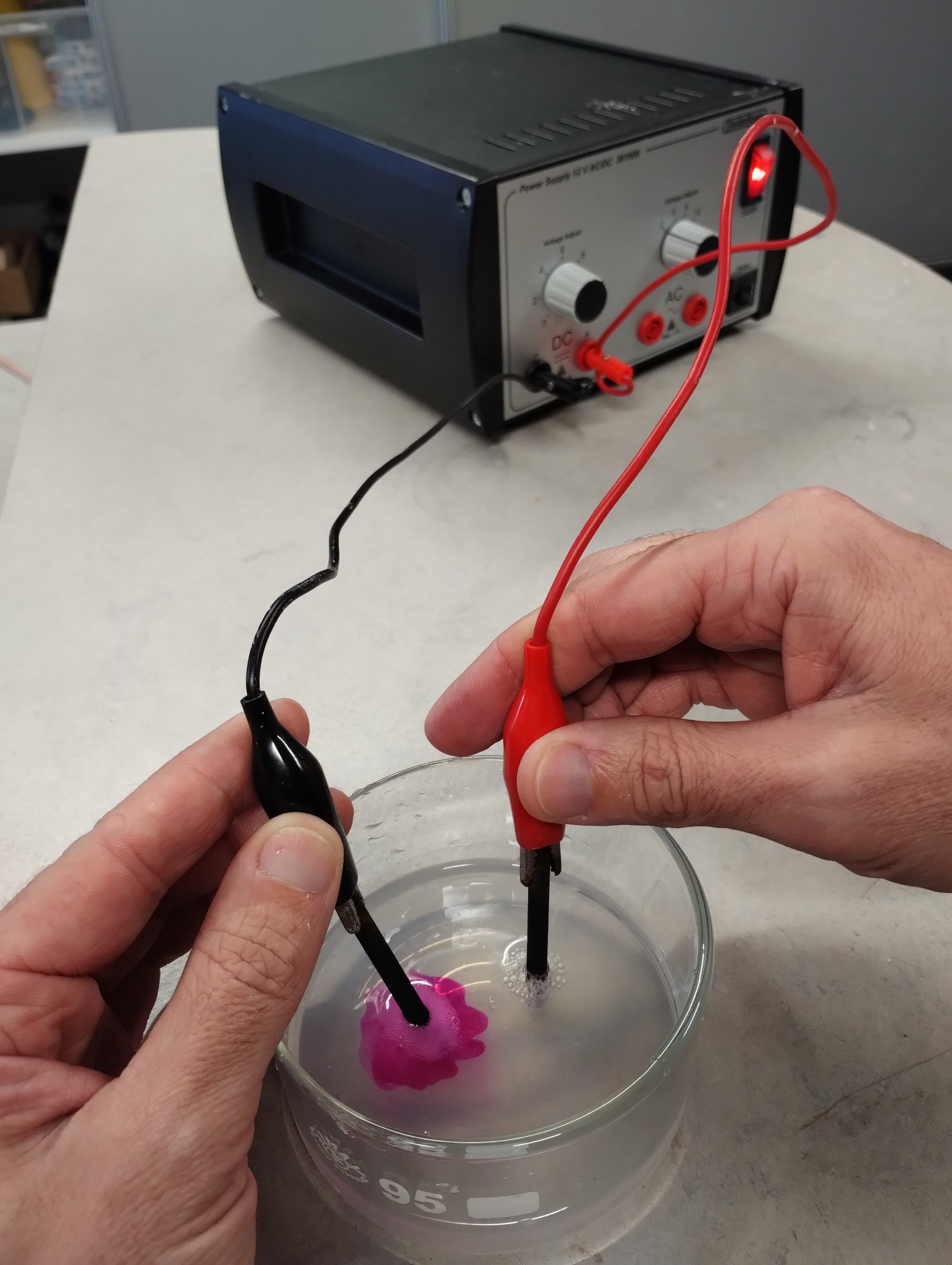Chloridové anionty na anodě odevzdávají přebytečný elektron a tím se oxidují na plynný chlór. Tak se také tento plyn průmyslově vyrábí. Vznikající chlór můžeme pozorovat jako malé bublinky na elektrodě a když opatrně chemicky přičichneme, tak také ucítíme jeho charakteristický štiplavý zápach, který je známý např. z bazénu. Případně můžeme k anodě přiložit barevný papírek a on se působením chlóru odbarví: