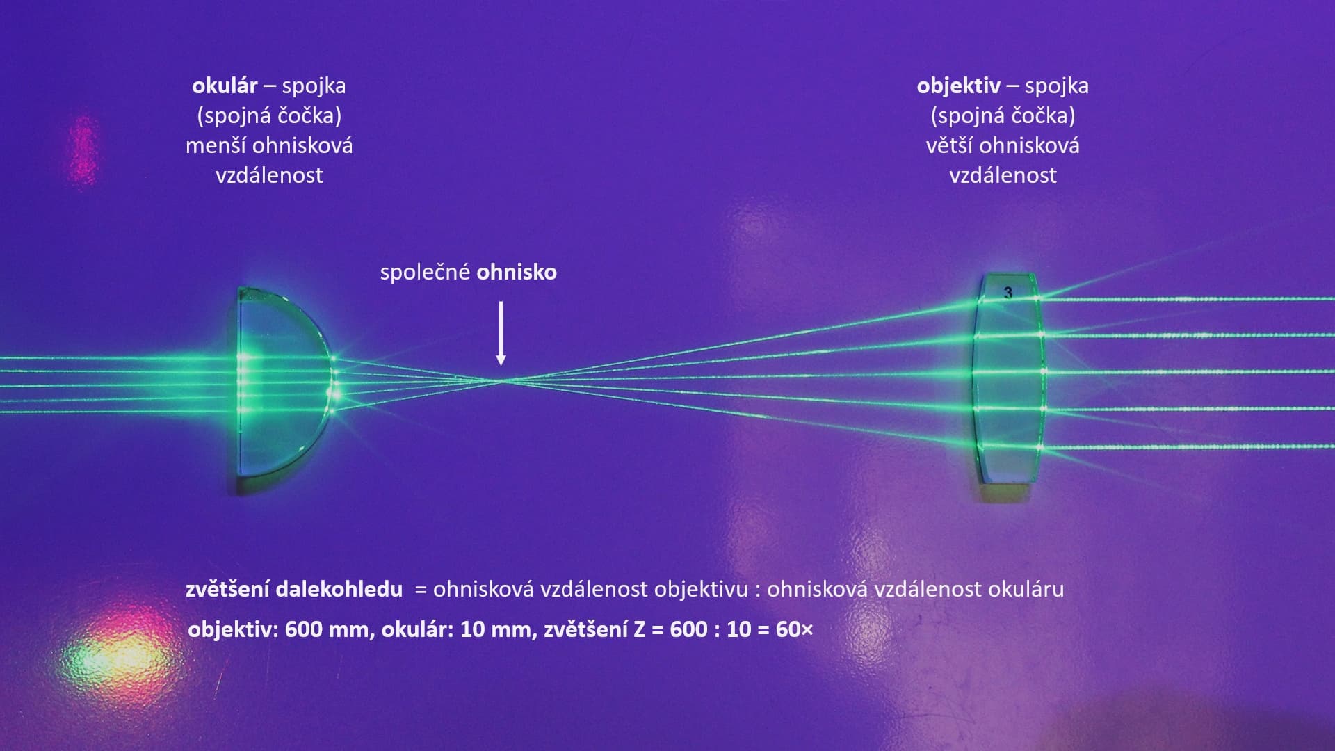 Oko se přikládá na druhé straně k čočce, které říkáme okulár. Tvoří jej čočka, které říkáme rozptylka. Paprsky, které jí projdou, se rozchází na všechny strany, jako by vycházely ze zdánlivého ohniska před čočkou.