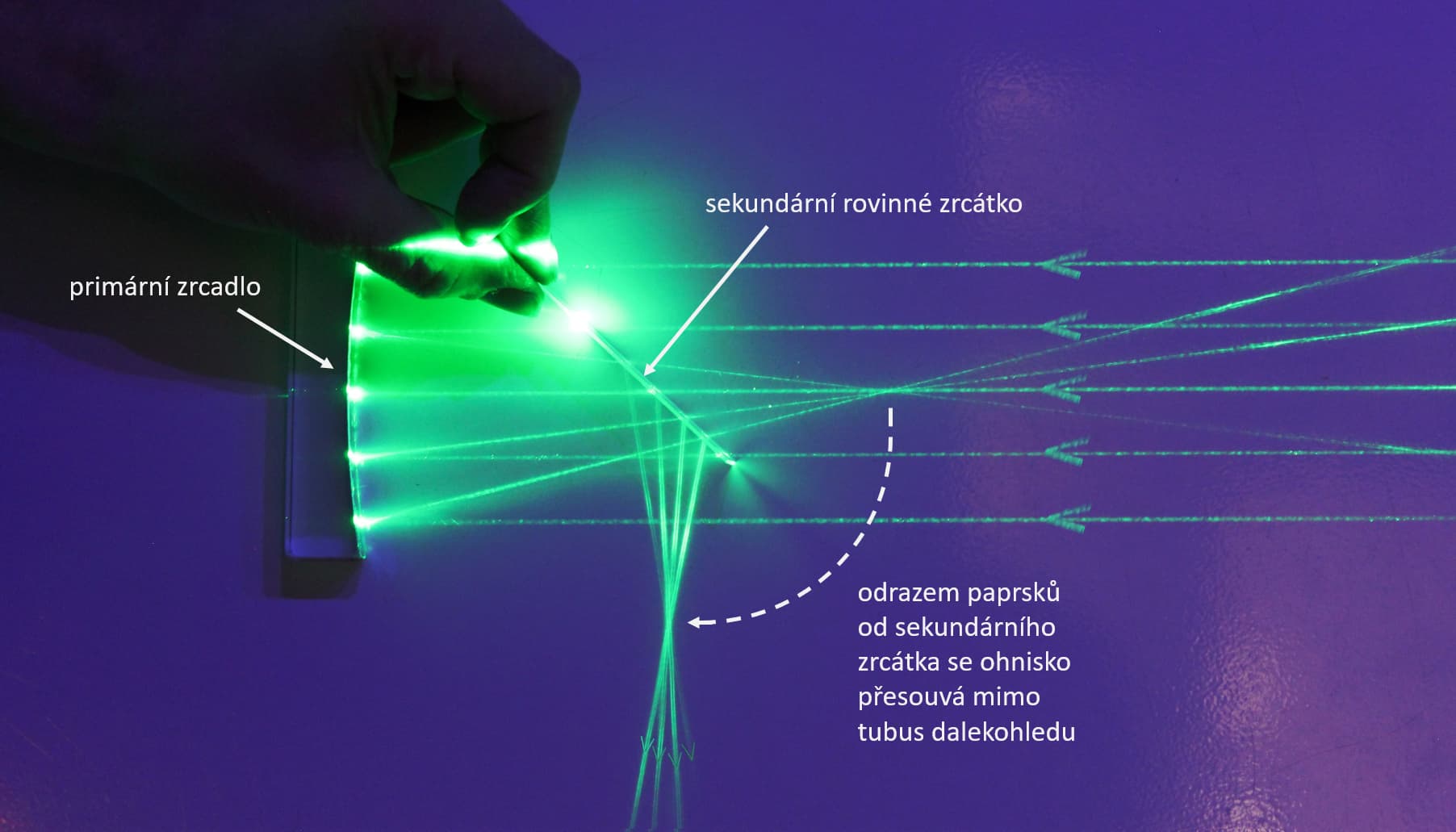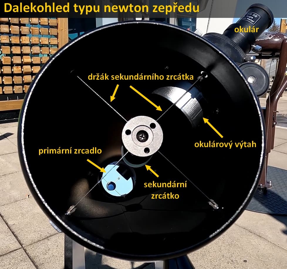 V úvodu jsme uvedli, že dalekohled vůbec nemusí obsahovat čočky, a přesto si s ním můžeme udělat fotografii oblohy. Zrcadlové dalekohledy totiž používají jako objektiv speciálně zakřivené zrcadlo, nejčastěji parabolického tvaru. To pak funguje jako čočka – soustřeďuje paprsky jím odražené do jednoho bodu – ohniska. Do tohoto ohniska se pak podíváme okulárem (tedy potřebujeme čočky), nebo sem přímo umístíme čip astronomické kamery nebo fotoaparátu.