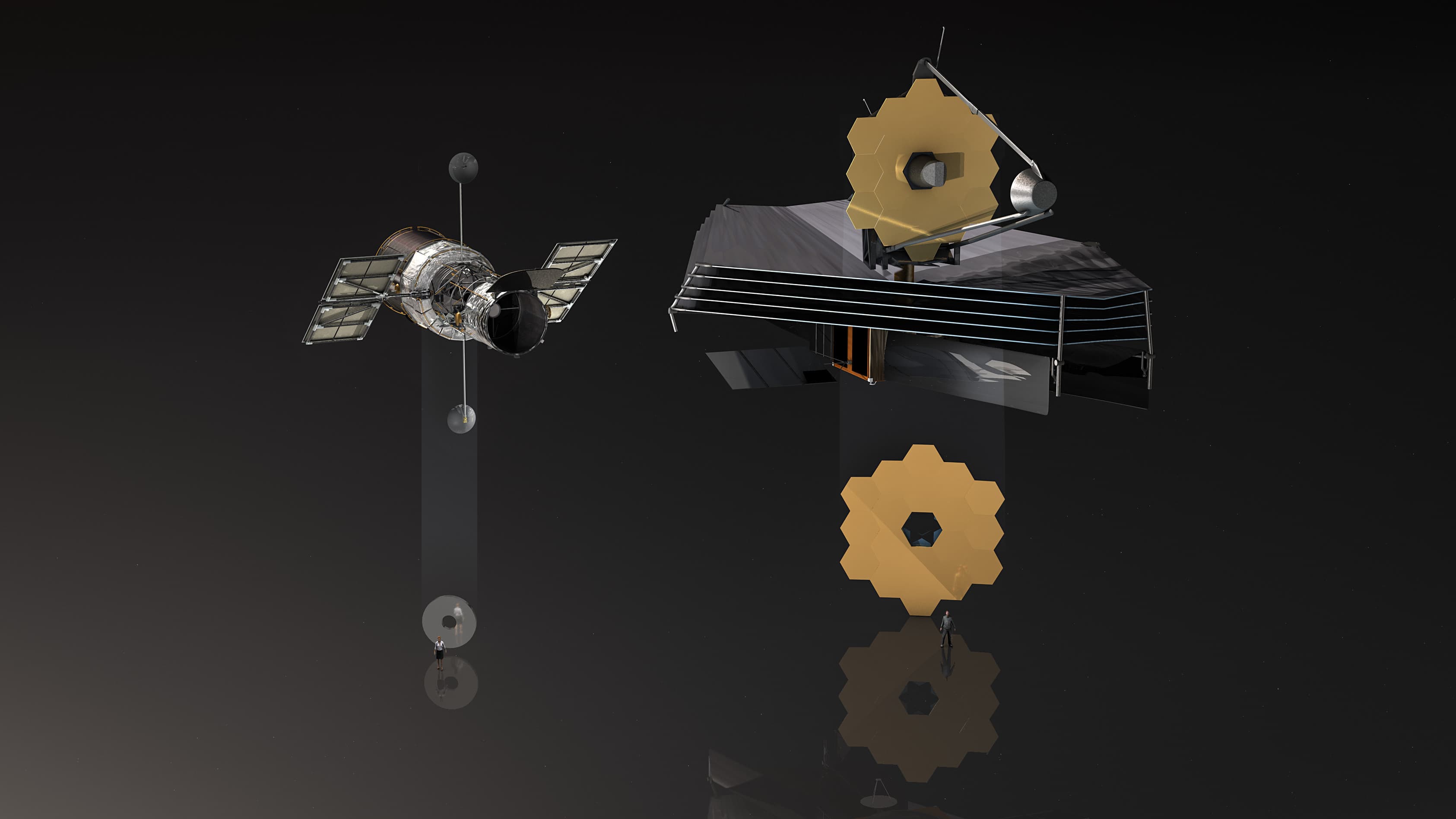 Obrázek č. 7: Porovnání vesmírných dalekohledů Hubbleova (HST) a Webbova (JWST)