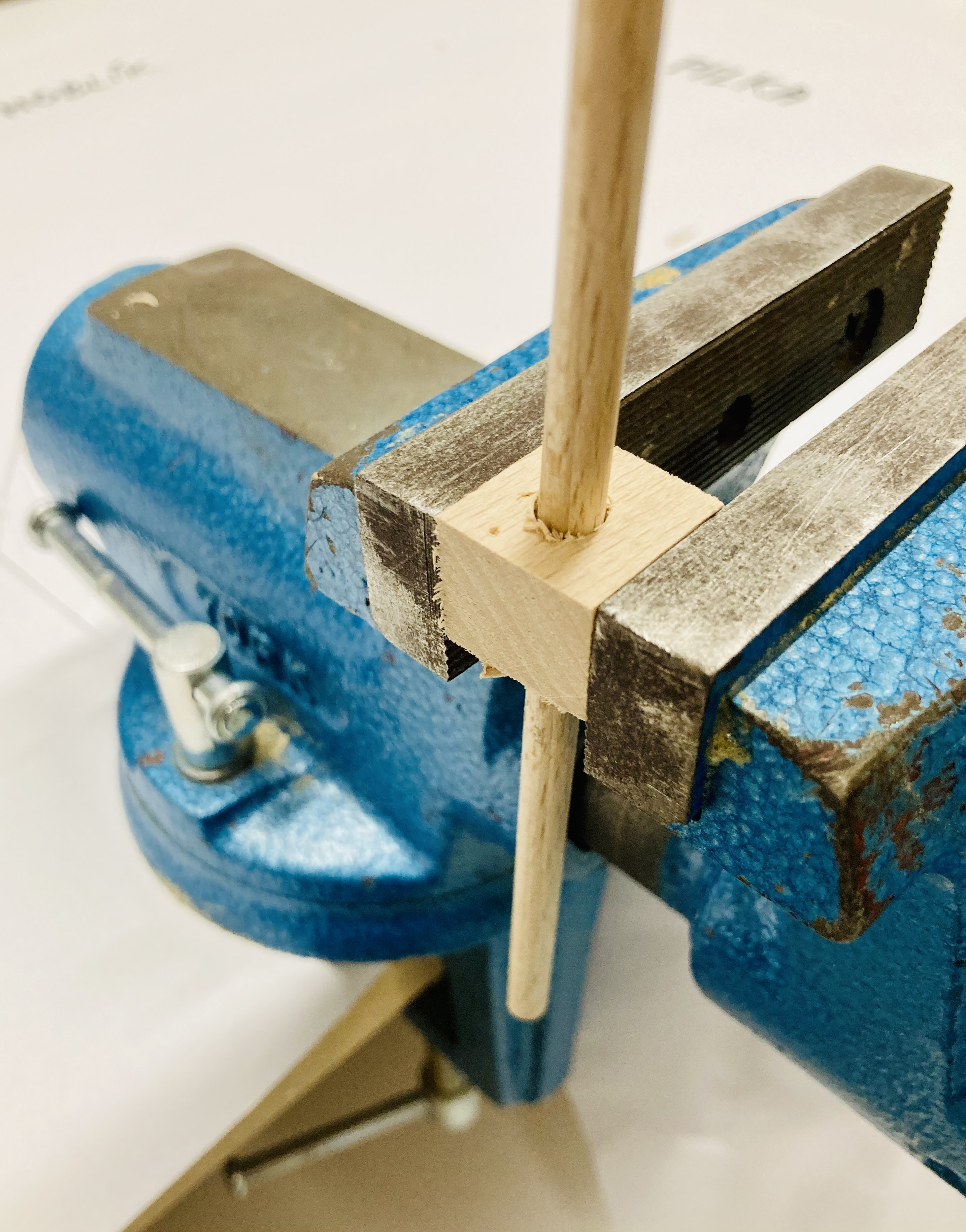 - Uřízněte z laťky krychli (hrana cca 15 mm), nebo použijte starou dřevěnou házecí kostku. (Hodí se sevřít ji do svěráku.)