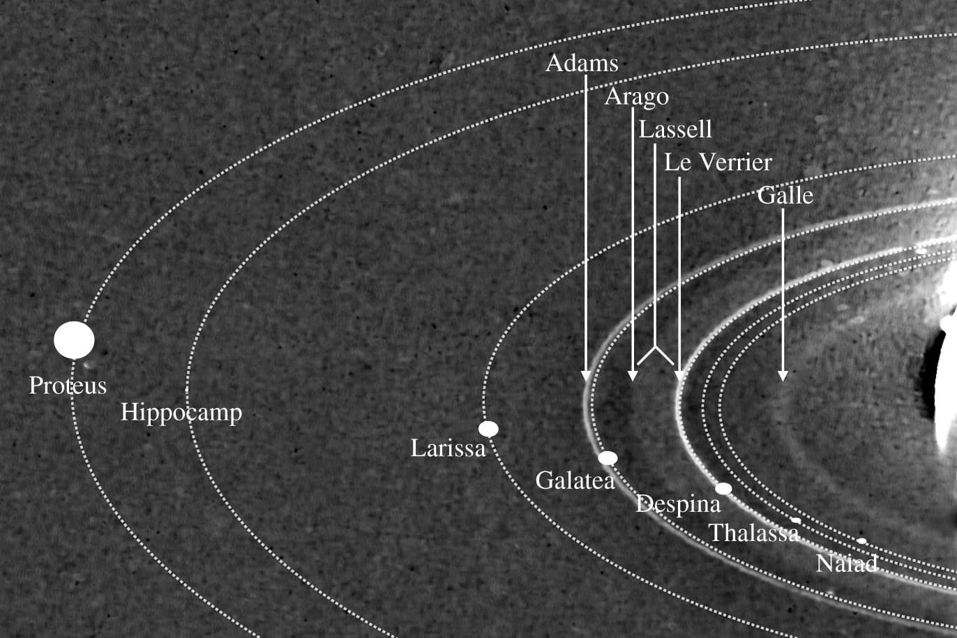 Neptunovy slabé prstence dostaly jména podle známých astronomů a jak je patrné, některé jsou utvářeny zde obíhajícími měsíci.