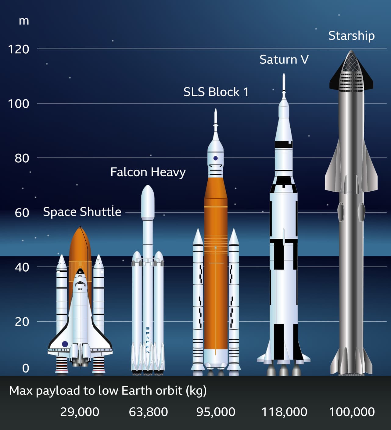 Obrázek 2: Porovnání SLS (uprostřed) a dalších významných raket. Zdroj: BBC