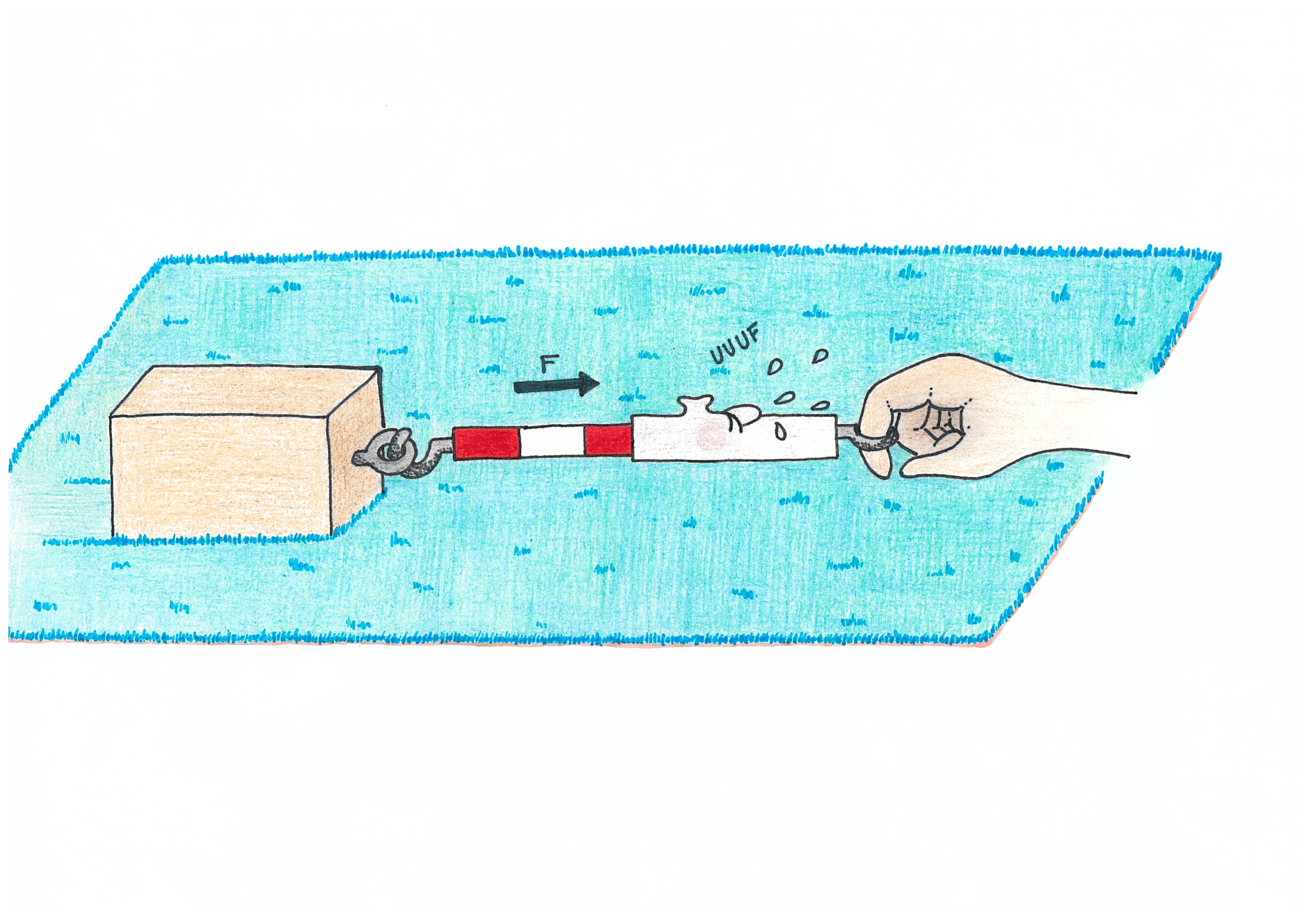 Kvádr položíme na koberec a pomocí siloměru za něj začneme táhnout. Siloměr ukazuje napřed velikost klidové třecí síly (dokud se kvádr trhnutím nerozjede), a pak třecí síly smykové (když kvádr rovnoměrně táhneme po stole).