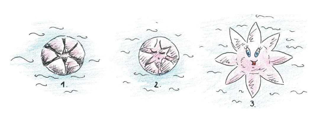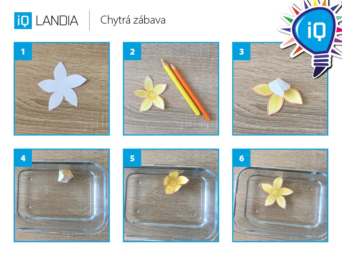 Složené kytičky pokládejte na vodní hladinu poskládanými lístky vzhůru. Po chvilce se lístky začnou rozevírat a kytičky „rozkvetou“.