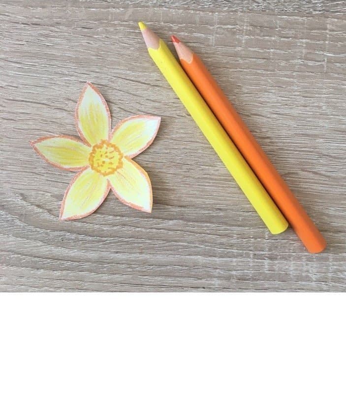 Z kancelářského nebo barevného papíru vystřihněte kytičky a opatrně jim přehněte okvětní lístky přes střed. Kytičky mohou mít různý tvar. Důležité však je, aby měly samostatné lístky, které můžeme přehnout. Využít můžete např. narcisy z naší šablony (soubor PDF je ke stažení na konci článku) nebo si nakreslit vlastní tvar.